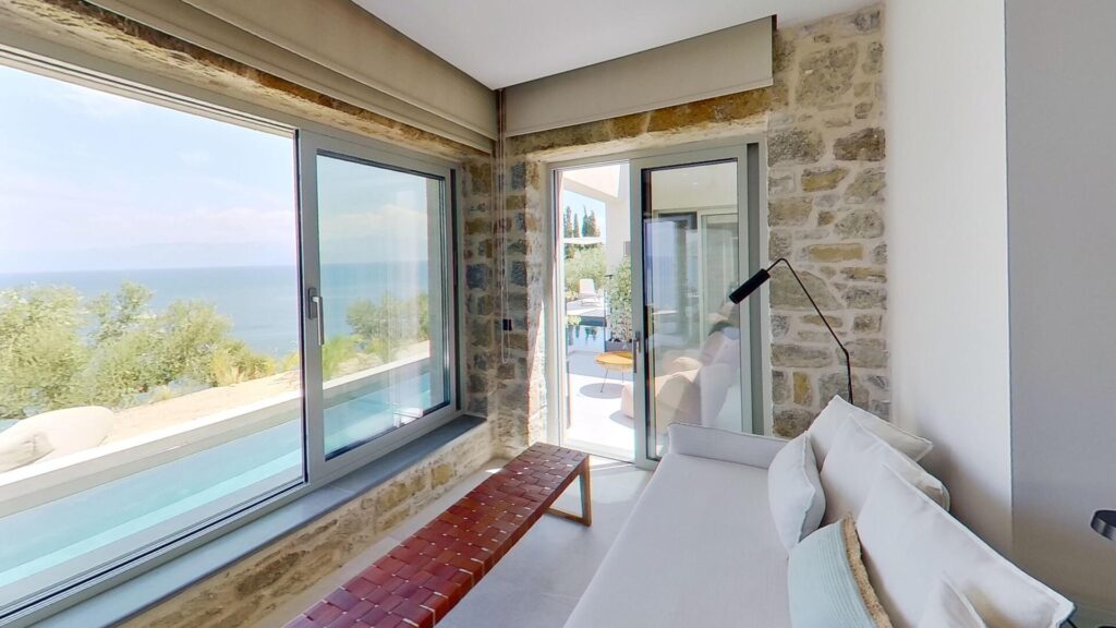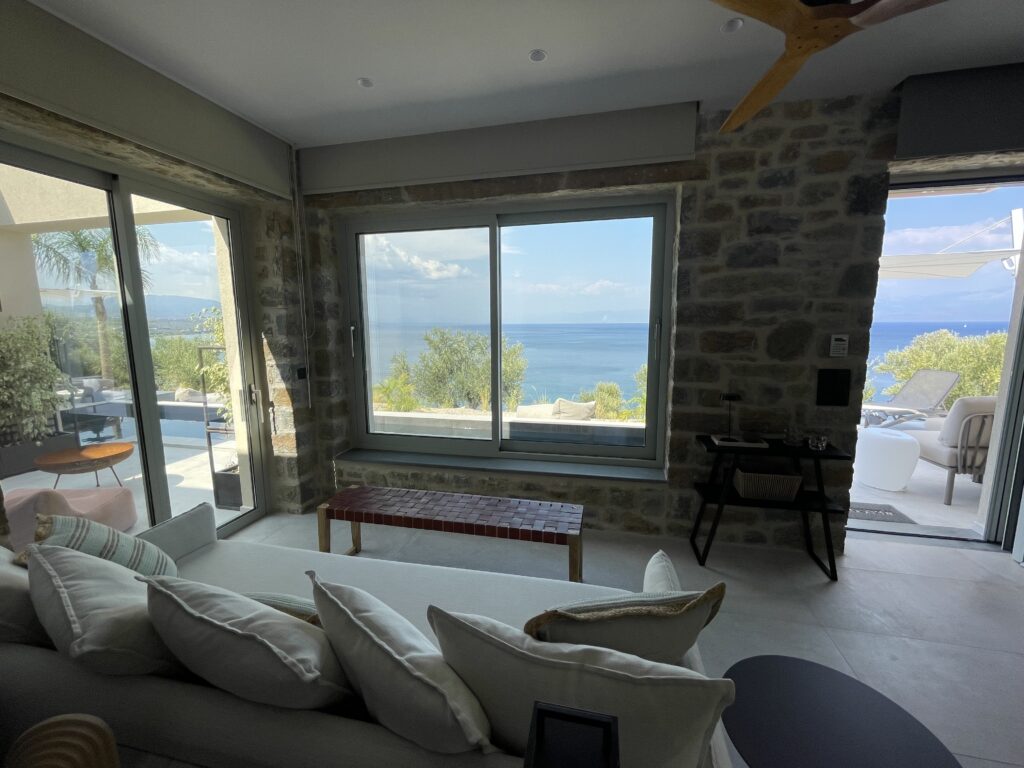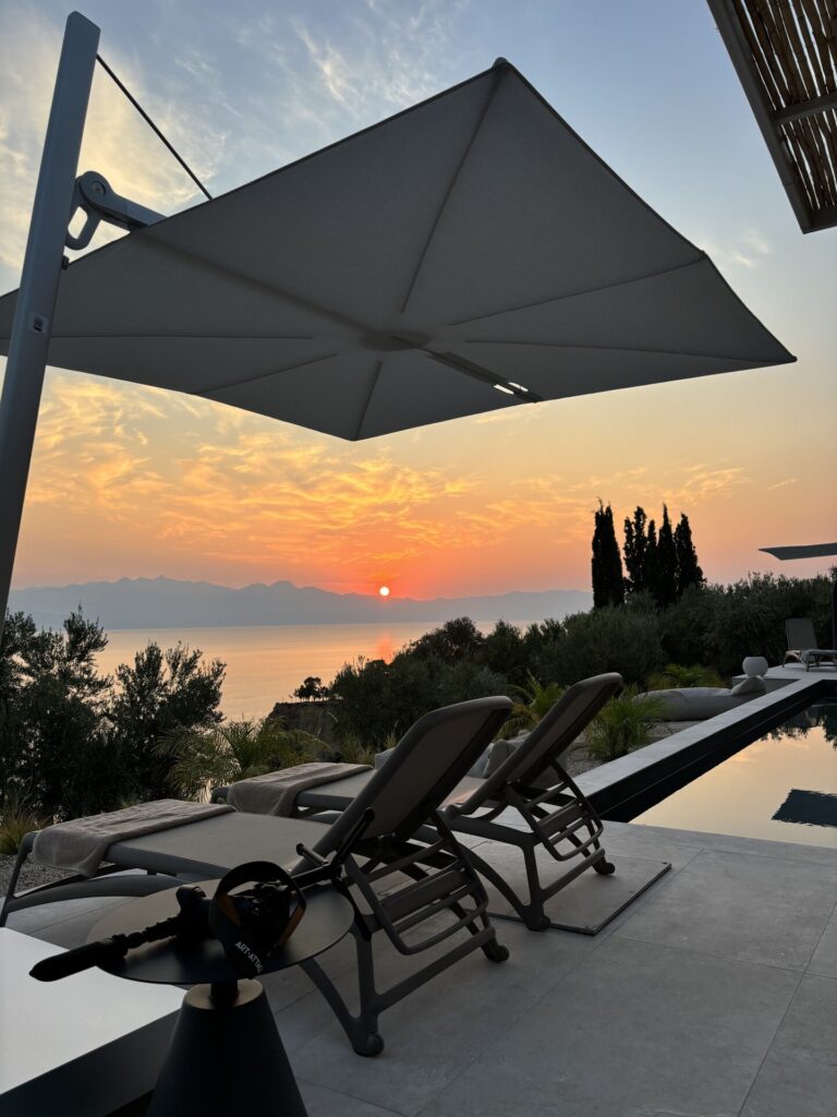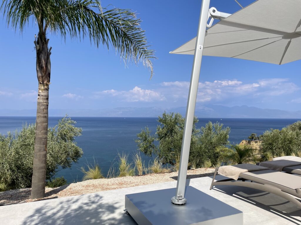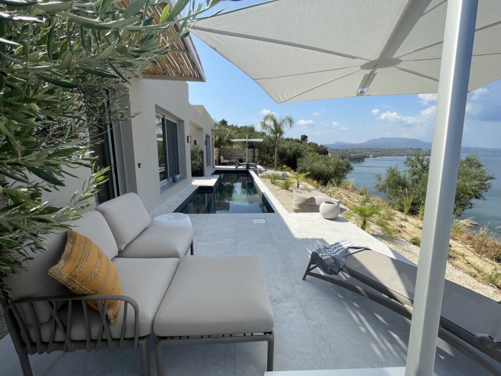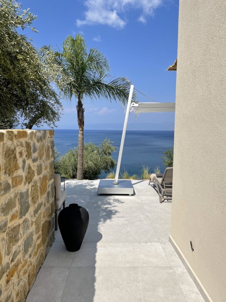 Guests enjoy a 10 m saltwater pool with unlimited views of the Messinian bay.